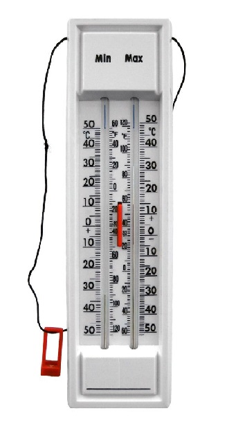 Small floats are pushed to each temperature extreme by the two columns and stay there until reset with the attached magnet or by pushing the red button on the front. N.I.S.T. traceable certificate of compliance available.