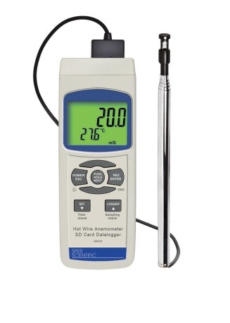 Reads air velocity and temperature and functions as a type K or J thermometer. Records data onto standard SD memory cards (like a digital camera). When full, simply exchange SD cards for unlimited data storage.